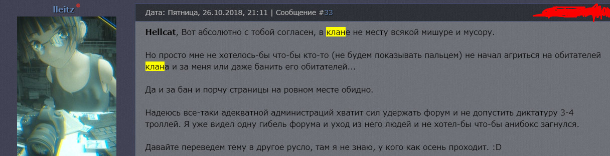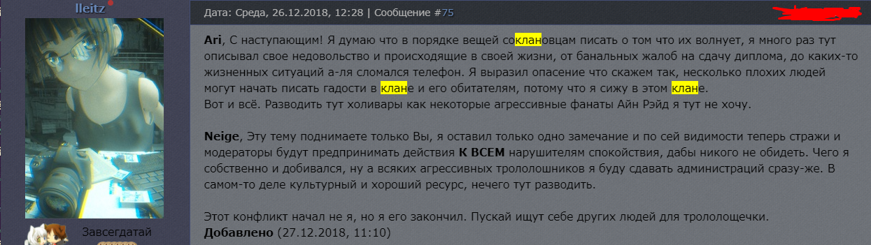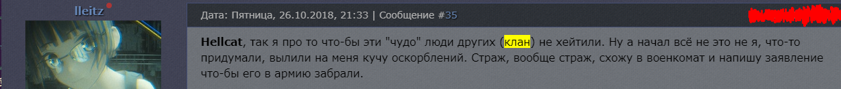 Anaiareita, Ну человек приходит в чужой клан и начинает всякие предъявы кидать лично в мою сторону, разве ответить не имею права? :Р Да и вроде как чутка негатива не запрещено, если нет оскорблений или чего-то подобного, разве нет? :0