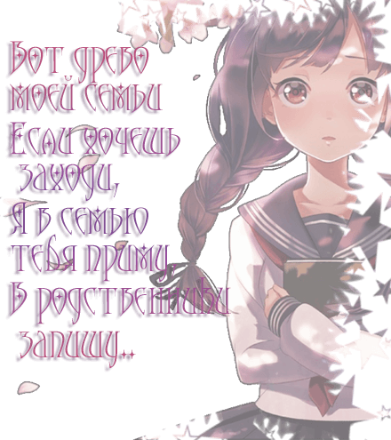 ![]() Всем мир, дорогие анибоксята! ![]() Сегодня вы оказались в моей обители, в мире моей семьи.. И я, SAKURA555, с радостью познакомлю вас с моими любимыми и дорогими родственниками. Прошу, устраивайтесь поудобнее, угощайтесь чаем...и приятно познакомиться! ![]() ![]() Муж - ... Мама - Психея Папа - ... Дочь - AngelicaWon, Лин Сын - ... Сёстры - Ari, Домовёнок, Kimiko_Nakano, Lisichka_Tyanka - старшие сёстры, Kаgura, Satsuki, Rumeur_Rose, Marsianka - младшая сестра Братья - классный Sorrow, демонический Yamato, талантливый Beyond Тётушки - Yewon, Jujube и Риас_Гремори Дядя - еран, DarkFire Дедушка - Crowley Внучка - ... Внук - ... Друг - Neige, Кайто, Kotovas, Tiki Mikk |