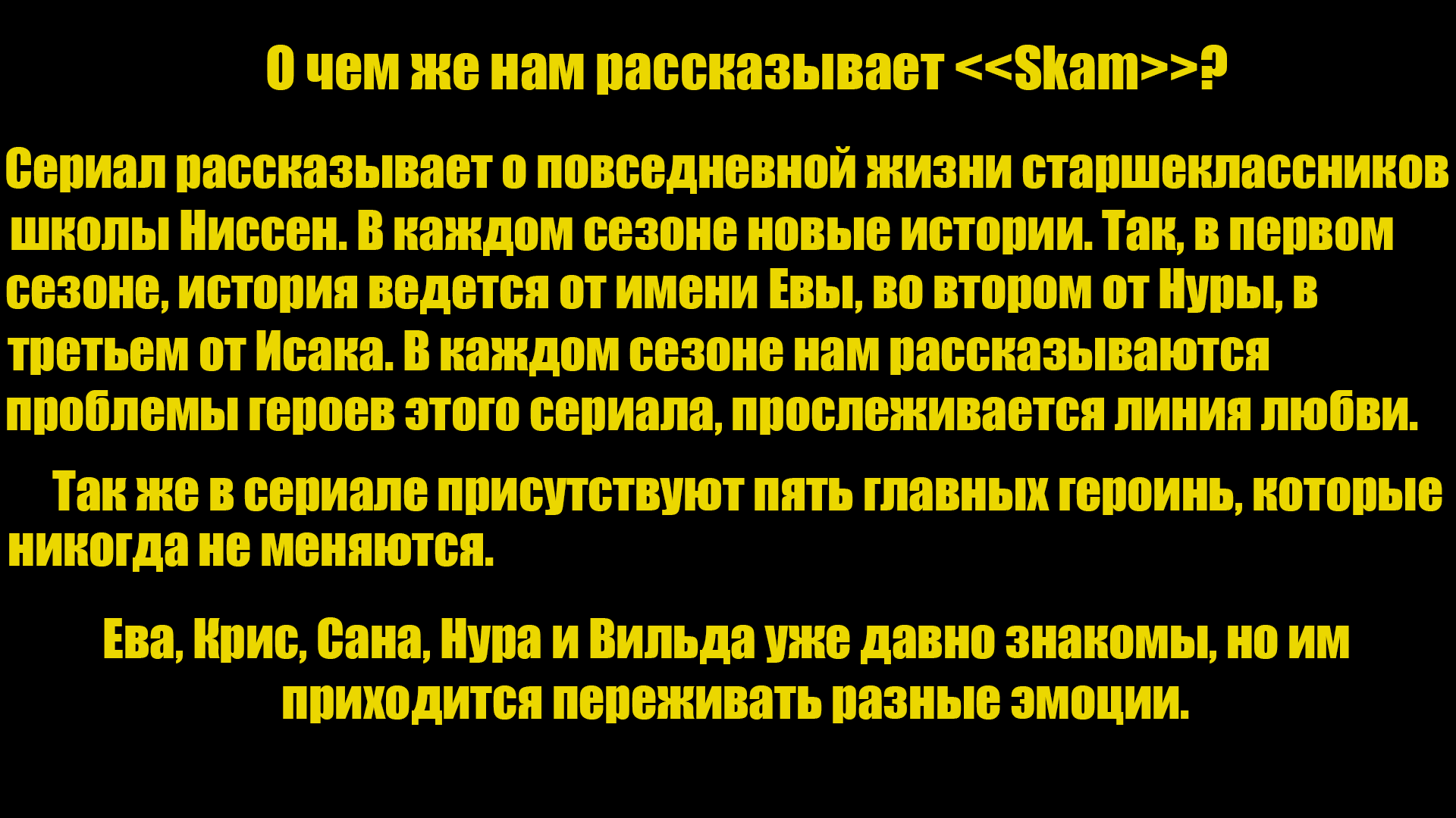 ![]() Привет-привет, Анибоксята! Наверное каждый слышал про сериал "Skam" или же видел в ленте Вк :D Ну а если ты еще не знаком с этим сериалом, то сейчас самое время. Ведь именно сегодня, Сахар расскажет вам про него! ![]() Год создания: 2015 Страна: Норвегия Жанр: Драма Продолжительность серий: 15-50 мин. ![]() ![]() ![]() Немного о главных героях: ![]() Ева Квииг Мун - главная героиня первого сезона. С наступлением нового учебного года Ева умудрилась поссориться со своими подругами и теперь общается лишь с Юнасом, своим парнем и его другом Исаком. В школе она знакомится с Нурой из испанского класса. Однажды, разговаривая с Нурой, к ним подошла Вильда, приглашая в автобус. Нура не сразу соглашается на приглашение в автобус, но после того, как Ева согласилась на приглашение, Нура все же объединяется с ними. После Ева знакомится с подругой Вильды - Крис, которая знакомит всех с Саной. Вот так и зародилась их дружба. Еву, которая встречается с Юнасом, ее подруги подталкивают на общение и знакомство с Кристоффером, другом Вильяма с третьего года обучения. И после этого ее отношения рушатся. ![]() ![]() Нура Амалия Сатре - главная героиня второго сезона. Девушка, презиравшая Вильяма, отговаривавшая Вильду встречаться с ним, сама будет с ним? Прямолинейная девушка, говорящая всю правду в лицо, она не встречалась ни с кем на протяжение всего первого сезона, что ее подруги даже стали подозревать, что она лесбиянка. Нуре и Вильяму приходится пережить много препятствий на своем пути. Будут ли они вместе? ![]() ![]() Исак Вальтерсен - главный герой третьего сезона. Близкий друг Юнаса, который пытается определиться со своей ориентацией. На одной из вечеринок ( 3 сезон) Исак прячет наркотики от полиции. Сана, подруга Евы и Нуры, замечает это и далее шантажирует Исака этим, чтоб тот вступил в клуб. Вступив в клуб, Исак видит одного милого парня - Эвен. Но тут же, на этом собрание в Иска влюбляется Эмма. Друзья Исака, замечают что их друг стал другим, после разговора, они узнают, что Исак гей. Но они не отворачиваются от него и продолжают дальше курить и ходить в школу вместе. ![]() ![]() Вильда Хэллеруд Линн - подруга Евы и Нуры. Можно сказать, что из нее не самый лучший друг. После того, как про Еву начали ходить грязные слухи, Вильда покинула их автобус и сторонилась своих подруг. Вильда страдает от не разделенной любви к Вильяму, который пользовался ею. ![]() ![]() Крис Берг - так же одна из пяти подруг. Почти во всех сериях она что-то ела. В первом сезона она даже положила глаз на Исака, но вскоре эта влюбленность испарилась. Любительница алкоголя. На все вечеринки, на которые она ходила, ее можно было увидеть с бутылкой какого-либо спиртного. Но в конце второго сезона с ней кое-что случается. ![]() ![]() Сана Бакуш - мусульманка. Какой бы не была красивая Ева, какой бы офигенный не был макияж у Нуры - это не переплюнет сарказм Саны. Рассудительная девушка в этой компании, не раз спорила со всеми, как и Нура. Давала хорошие советы по развитию автобуса и не только. Помогла Нуре с ее отношениями. ![]() ![]() Вильям Магнуссон - тот самый Вильям, по которому сохнет почти вся школа и в постели которого побывали почти все девушки школы. Так же как и Нура является главным героем второго сезона. Вечеринки Вильяма считаются самыми крутыми и проводятся чуть ли не каждую неделю, а может и каждый день. Но все слухи, что ходили по школе не все