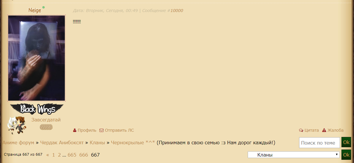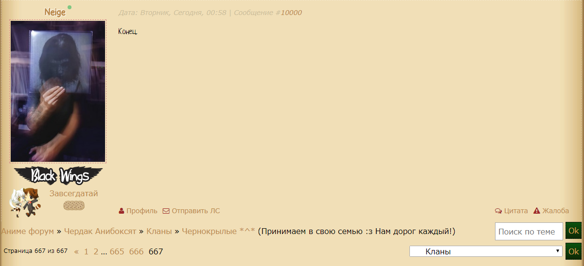 ![]() Здравствуй, анибоксёнок! Ты забрёл в воистину волшебное местечко. Любое твоё сообщение останется здесь и войдёт в историю. Не веришь? А ты проверь!В этой темке можно делать всё что угодно, даже чуточку флудить. Но есть и некоторые условия, которые надо соблюдать: 1. Выкладывать смешные переписки из чата/форума/ЛС; 2. Выкладывать приколюшки, которые связаны с Анибоксом и его обитателями (мемы); 3. Выкладывать рисунки, которые связаны с Анибоксом и его обитателями; 4. Да чего уж скрывать, любые вещички, которые связаны с Анибоксом и его обитателями. Эту темку можно считать чем-то вроде вечной благодарности администрации, команде сайта да и самим обитателям, без которых Анибокс не может существовать. Смелее, Друзья! ![]() Упс, в меня вторглись - Кирпичик - Среда, 16.11.2016, 01:30 |