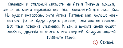 К сожалению, я смотрела только Атаку Титанов, поэтому тыкаю третий вариант ответа. Посмотрела трейлер к Кабанэри и очень даже заинтересовал. Есть схожести в сюжетах. А ещё мне показалось, или там местами даже рисовка была схожая? В одном стиле. Случайно не одна и та же компания рисовала? Может быть, и посмотрю потом анимешку.:З P.S Спасибо за интересную темку *О* |
