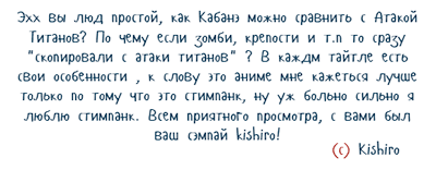 Вот мой к нему коммент^^ Ну,что я могу сказать, прекрасное аниме. Конечно чем-то похоже на Атаку Титанов, чем-то но далеко не всем, ну это неизбежно, ведь режиссер один. Конечно события развиваются быстро, но это тоже неизбежно при 12 сериях, да думаю будет скорее всего продолжение, и может не на один сезон. Интрига слегка есть, конечно ее меньше чем в Атаке, но тоже есть, мы можем лишь логично поразмышлять об истории аниме, но думаю, мы можем и ошибиться. Многое понравилось и то,что казалось бы у них эпоха сегуната, но уже есть технологии, конечно это неизбежно, когда опасность люди развиваются, и талантливые умы придумывают оружие, мне особо это понравилось. Персонажи тоже прекрасно, конечно за 6 серий я думаю их показали далеко не всех, но я с радостью буду ждать продолжения. Сирень рекомендует^^ |