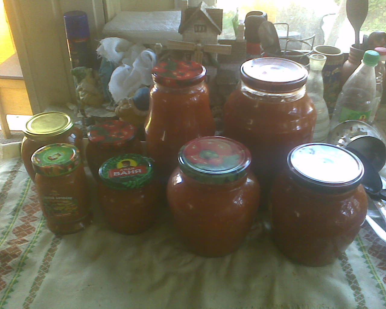Берем 1 часть красных помидор, 1 часть красного сладкого болгарского перца (можно желтого, но лучше всё ж красного), 0,6 части лука, сваливаем в кастрюлю, добавляем стакан воды, чтобы при старте до выделения сока не пригорело, и кипятим, периодически помешивая, особенно со дна. Как овощи дадут сок, добавляем туда по вкусу соли и сахара (если помидоры спелые, то в равных долях, а если дозревали в диване и кисловатые, то сахара чуть больше), после чего, когда лук и перец доварятся и перестанут хрустеть на зубах, вливаем это в хорошо отмытые банки. Сверху добавляем по 1-2 ложки растительного масла (подсолнечного чаще всего). Прикрываем крышками (не наглухо), ставим в достаточной высоты кастрюли (чтобы банки на 2/3 были в воде или лучше чуть не доходя до горлышка), подсунув под эти банки на дно кастрюли огрызки древнего вафельного полотенца или марли. Кипятим, в зависимости от размера банки варируется время, 0,5 банки хватит и 20 минут покипеть, трехлитровую лучше выдержать минут сорок. Вынимаем (не голыми руками), закатываем/завинчиваем наглухо крышки. Ждем 3-5 минут (чем больше банка, тем дольше ждем) и переворачиваем (сразу не переворачиваем, иначе крышку сорвет от подскочившего давления). Получается вот что-то такое Это можно пожирать в разных видах - годится как соус, которым можно мазать пиццу до выпекания, как добавление к отварной гречке, как соус для тушения мяса или как соус для варки/тушения фаршированного смесью риса и мясного фарша болгарского перца. Неплохо идет с картошкой, рисом, гречкой ну или если совсем лень готовить то так с черным хлебом, хотя это скучно. Хранится эта штука в прохладном месте вроде погреба или холодильника. В жаре на солнечном свету не хранится. Уксус туда по рецепту не добавляется, он там не нужен. Добавлено (16.10.2021, 00:41) |