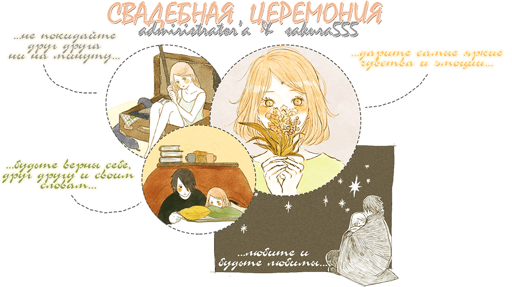 ![]() Доброго времени суток, дорогие Анибоксята! Здесь и в данный момент, 2 октября 2017 года, состоится церемония бракосочетания admiristrator'a и SAKURA555. Жених - admiristrator'a и невеста - SAKURA555, произнесут клятву перед лицом всея Анибокса и вступят в законный интернет-брак. Дорогие свидетели, obrechen и Marsianka, и присутствующие гости, если кто-то из вас знает причину, по которой этот брак не может быть совершён, то пусть говорит сейчас или вечно хранит молчание. Причины прерывания брачной церемонии: ~1~ Многожёнство / многомужество; ~2~ Длительное отсутствие мужа / жены; ~3~ Не истечение послеразводного срока; ~4~ Не согласие одной из сторон; ![]() Жених и невеста, по очереди произнесите клятву, для скрепления ваших уз: Жених: Я, ник ж., беру тебя, ник н.... Невеста: Я, ник н., беру тебя, ник ж.... Жених: ...в законные жёны... Невеста: ...в законные мужья... Жених: ...клянусь оберегать тебя... Невеста: ...и безоговорочно верить... Жених: ...помогать и не оставлять в беде... Невеста: ...любить и дарить всё своё время... Жених: Я - твой, ты - моя. Невеста: Я - твоя, ты - мой. Вместе: Клянусь! ![]() |