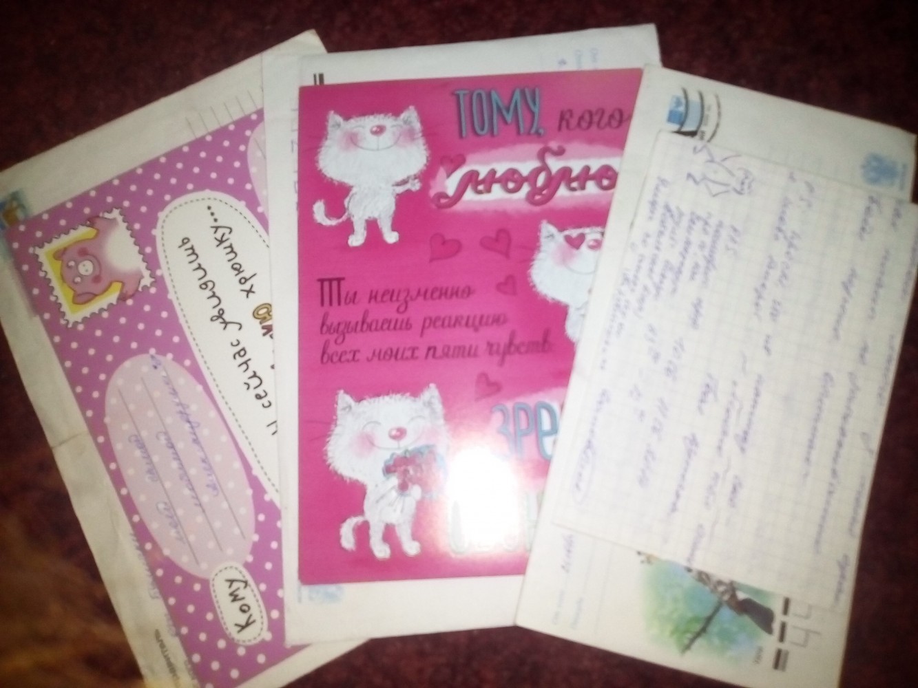 И тишина.. и никто не хочет делиться счастьем. Дело прошлое. Но очень приятное. За всю жизнь мне прислали всего 3 письма. И эти 3 письма я каждый раз получала с удивлением, трепетом и слезами на глазах. Потому что они были отсюда, с Анибокса. Получила эти письма я вне конкурса. Но все равно мне приятно поделиться ими с вами. Маленькой их частичкой. Они поистрепались, но только конверты. Все содержимое осталось в целости и сохранности. А главное, в душе и в памяти. Не бойтесь и не стесняйтесь. Домо и Риас ни за что не сдадут ваши адреса маньячинам, ручаюсь! <: Зато сколько эмоций от прочтения? Передать письмо в руки. Или написать его в онлайне - это совсем другое. Ваше письмо должно пройти суровый путь Почты России /*и не только*/ и только тогда оно станет самым настоящим письмом. P.S.: Фото с телефона >:З |