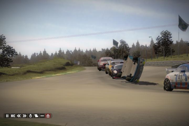 Моя машина слева, с треснутым стеклом. Это я в кого-то случайно врезался на старте. |