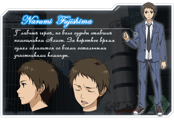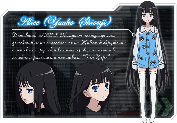 Выясняется, что ребятки эти помощники детектива, которые бросили учёбу и теперь занимаются поимкой преступников. А самим детективом, на которого они работают, оказывается девочка-хиккикомори, которую все зовут Алисой. Алиса – маленький гений, который раскрывает дела, не выходя из комнаты при помощи доступной ей информации. Теперь Наруми, хочет он того или нет, оказывается втянут в детективные расследования сумасшедшей команды.