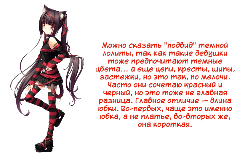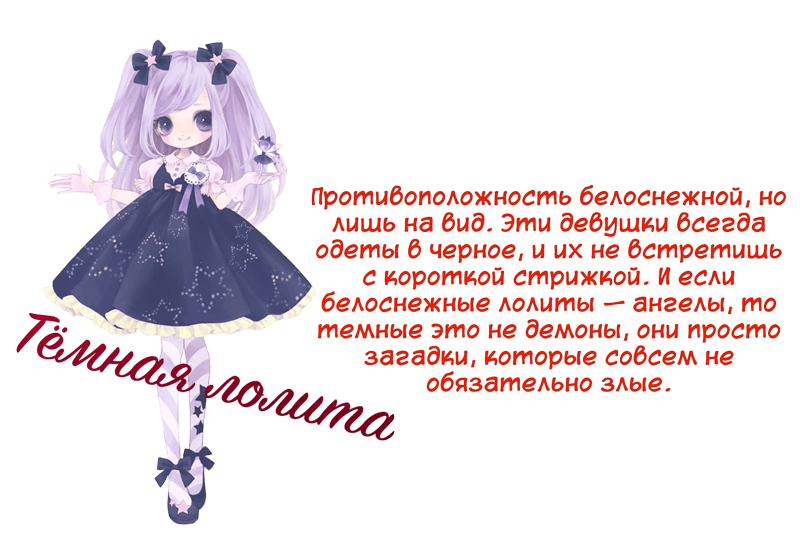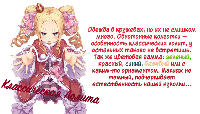 Это так сказать "разновидности по цветам". Довольно правильное разделение, я тоже считаю, что три крайности это белый, черный и красный, хоть в нашем случае последний цвет розовый. Есть другие варианты лолит... как вам героиня всем известной книги? Нравится?
