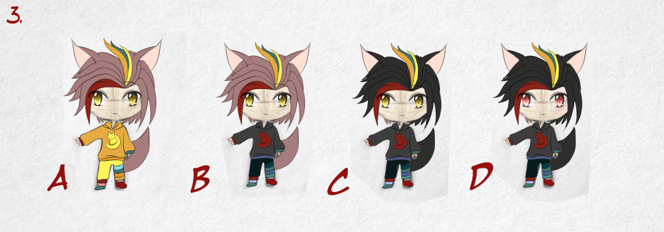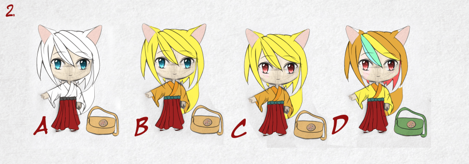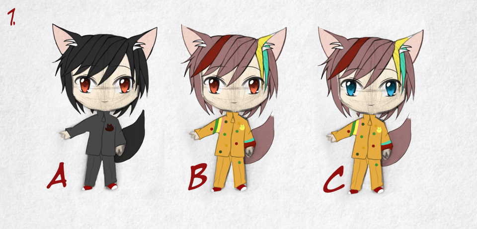 Итак, моё мнение. Из расцветки волос и хвоста мне понравилась первая девочка, но для сайта, думаю, подойдёт что-то более рыжее как 2D (особенно привлёк белый кончик хвоста и ушек, правда на работах 1B и 1C кончик хвоста выглядит симпатичнее).