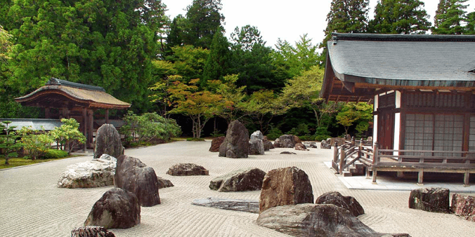 Основой японского сада камней является, конечно же, камень. Камень в первозданном виде - главный атрибут японского парка. Эстетические свойства необработанного камня в основном используются в архитектуре «сада камней». Японский сад камней - уникальное сооружение. Его основная территория покрыта песком или мелкой галькой, а по нему, так сказать, рассыпаны группы грубых камней. Однако беспорядок только кажущийся. Расположение групп и состав камней в группах подчиняются правилам, вытекающим из мировоззренческих концепций дзен-буддизма. Камни расположены группами по три в соответствии с буддийской триадой. Сады камней функционально созданы для медитации, уединения от мирской суеты и повседневных проблем. Дизайн таких сооружений, соответствующий стандартам дзен-буддизма, усиливает желание японцев к любованию природой, к медитации и уединению. Здесь в явной форме проявляются такие принципы, как умение видеть очарование обыденности и изящная простота.